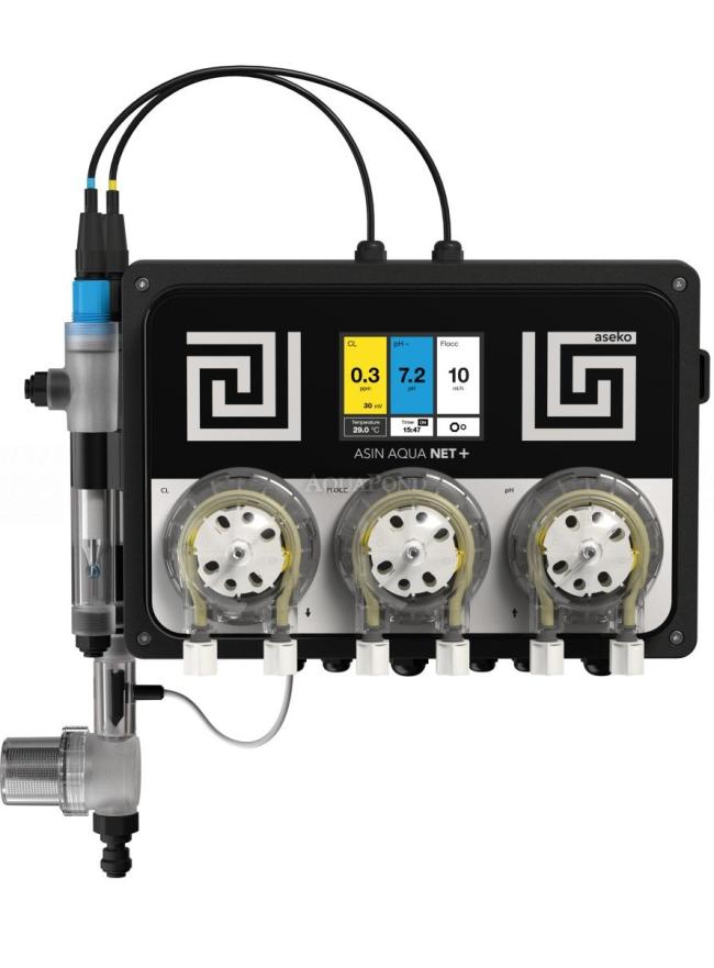 Dávkovací stanice Aseko Asin Aqua Net+ CLF je automatika pro dávkování bazénové chemie pro úpravu vody v soukromých bazénech vhodný pro použití v bazénech a vířivkách o objemu do 250 m3.Je vybaven sondou CLF pro měření volného chloru a pH sondou pro automatickou regulaci hodnoty pH. Zařízení nabízí základní funkce řízení bazénové technologie, které splňují požadavky na každodenní provoz domácích bazénů.Má instalován LAN konektor pro připojení k internetu. Pomocí aplikace iPool LIVE v mobilním telefonu můžete kontrolovat všechny nastavené hodnoty kvality vody v bazénu a události, které jsou spojeny s provozem bazénu a dávkováním chemie.