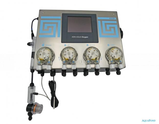 Dávkovací systém pro komplexní úpravu bazénové vody. Díky 4 dávkovacím čerpadlům lze současně dávkovat OXYPURE, pH-, Algicid a FLOC+C, tím je dosaženo krystalové čisté vody. ASIN Aqua OXYGEN dávkuje FLOC+C kontinutálně - speciálním pomaloběžným čerpadlem PP10. Asin Aqua Oxygen tvoří kompaktní celek skládající se z řídící jednotky, elektrody pro měření pH a čtyř dávkovacích čerpadel o výkonu 60 ml/min. Hodnoty chemie se zobrazují na vestavěném dotykovém displeji. Automatiky Asin Aqua Oxygen jsou standardně vybaveny i pomocným relé pro připojení bazénové filtrace s příkonem až 1,4 kW a teplotním čidlem pro kontrolu a zobrazování teploty vody v bazénu. Přístroj lze namontovat i na stávající starší filtrační systémy, které zatím nemají žádnou dávkovací automatiku.