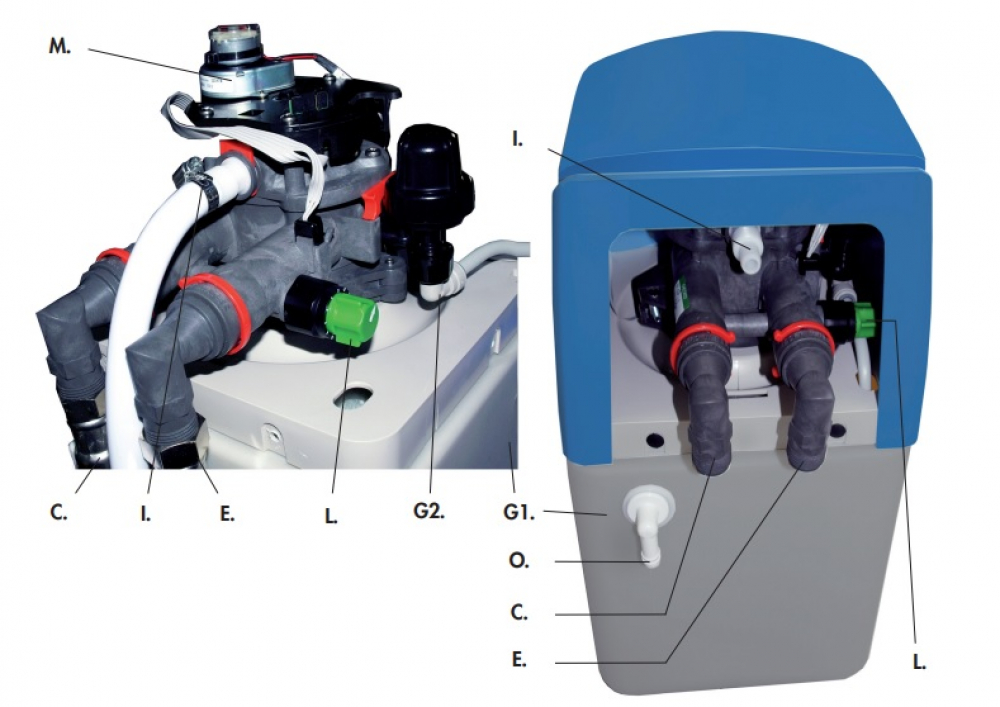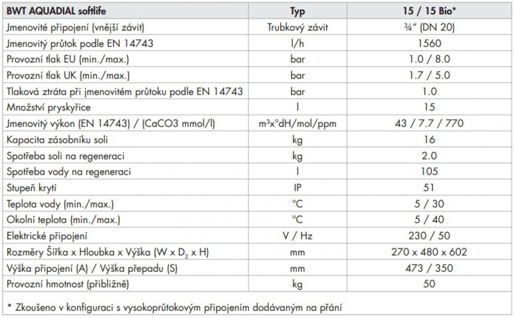 | E. | Výstupní připojení (změkčená voda) | pro ohebnou hadici, se závitem ¾ “ |