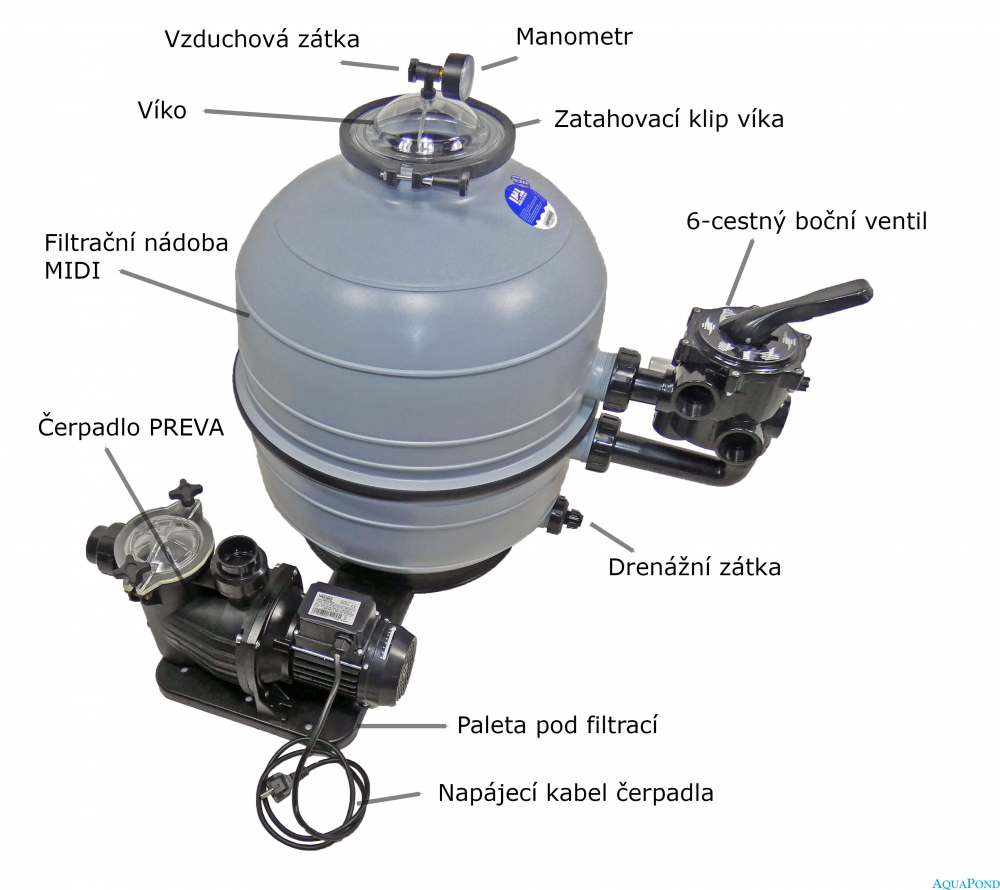 Filtrační zařízení KIT MIDI 400 je možné použít pro recirkulaci vody v bazénech, jezírkách, lázních a whirpoolech. Pískové filtry pracují na přirozeném principu filtrace vody. Voda prostupuje uloženou vrstvou písku, která zachycuje drobné nečistoty. Tímto způsobem se pochopitelně písek zanáší a je nutno jej propírat, k čemuž nám slouží šesticestný ventil. Pootočením ventilu do polohy praní písku změníme směr proudění vody a tím vyplavíme usazené nečistoty do odpadu. Tento proces můžeme opakovat po celou životnost písku, která je ve srovnání s jinými filtračními metodami velmi vysoká. Písková filtrace KIT MIDI 400, 6 m3 / hod se skládá znádoby na pískovou náplň, čerpadla s vlasovým předfiltrem, 6-ti cestného ventilu a podstavce (palety). Filtrace KIT MIDI 400 je dodávána v rozloženém stavu. Před připojením k bazénu je třeba ji smontovat. Montáž a uvedení do provozu jsou jednoduché. Filtraci můžeme připojit do okruhu bazénu lepením na PVC trubky i flexi hadice o průměru 50 mm.
