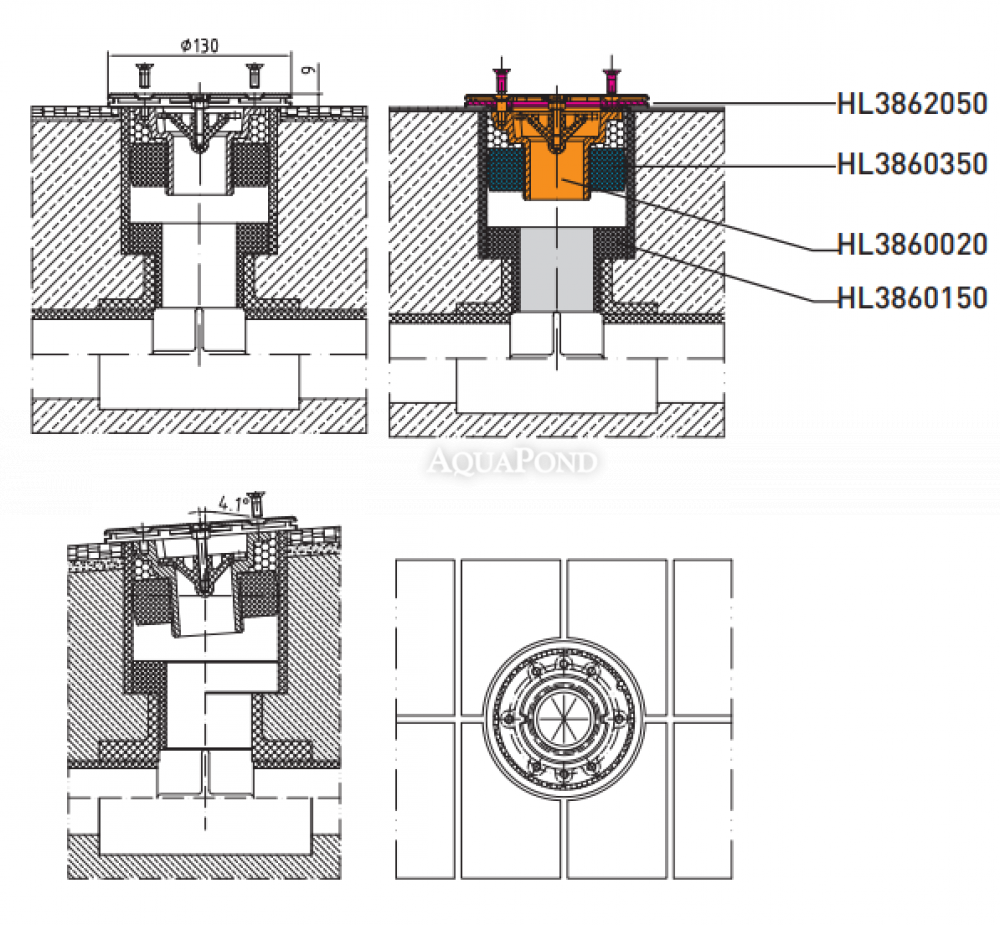 Pro instalaci trysky 3860021 na dno bazénu jsou nutné dva adaptéry 3860150 a 3860350 a sada příruby 3862050 (volitelné, nutno dokoupit).