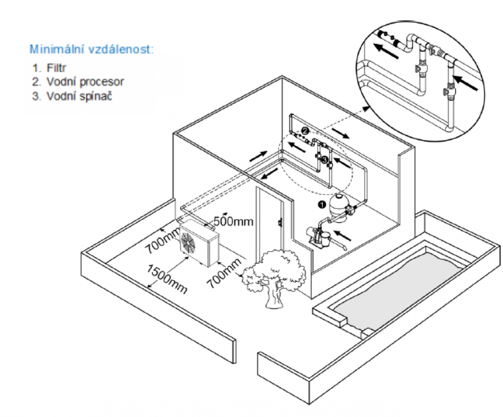 Pro zapojení do filtračního okruhu se tepelné čerpadlo dodává se šroubeními pro vlepení PVC trubky 50 mm. Tepelné čerpadlo vždy zapojujte do bypassu, tedy do tříventilového obtoku, abyste mohli regulovat průtok vody čerpadlem. Při nižším průtoku se lépe předává teplo do bazénové vody.