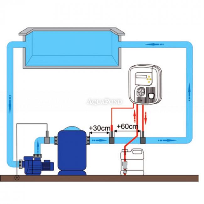 Regulace množství chlóru v bazénové vodě : automatické dávkování tekutého chlóru v závislosti na stavu vody. Automatická regulace pomocí proporcionálního cyklického dávkování chlornanu. Může být nainstalován do všech zabudovaných bazénů na pevné potrubí. Uživatelsky jednoduché menu na dobře čitelném LCD displeji. Stav sondy zjistíte během kalibrace. Funkce " BOOST " : zvýší dávkované množství chlóru pro intenzivní užívání bazénu nebo při náhlé změně počasí. Kontrola hladiny chlóru v kanystru. Vysoké krytí IP 65.
